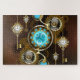 Turquoise lenses with antique watch with brass gears and golden keys on rusty, brown background. Steampunk style.