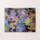 Puzzle de 11" x 14" avec une image de tasses colorées et de théières sur le noir. Voir l'ensemble de la collection Wonderland Puzzle dans ACTIVITIES | Section Puzzles.