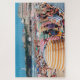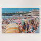 La photographie originale de ZoeSPEAK sur ce Puzzle Jigsaw est une scène estivale classique à Biarritz, en France, une destination de vacances populaire sur le golfe de Gascogne dans le pays basque. En haute saison, la plage est pleine de monde, et la Grande Plage est habillée de ces emblématiques tentes de plage, rayées de blanc avec du rouge, du jaune, du vert ou du bleu. Les tentes aux couleurs vives ajoutent à l'atmosphère de vacances le long de l'esplanade, avec vue sur le phare au sommet des falaises, et l'Hôtel du Palais en arrière - plan.