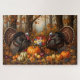 An autumn forest with two wild turkeys and an abundance of pumpkins, squash, grapes, and flowers make a gorgeous Thanksgiving-themed jigsaw puzzle.