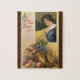 Illustration vintage Carte postale Thanksgiving avec une femme et une cornucopie de fruits avec le texte "All Thanksgiving Bounty Be Thine."