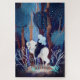 Illustration numérique représentant une belle femme dans une longue cape noire sur un cheval mousseux blanc, debout sur une colline au milieu d'une forêt magique bleue avec des animaux sauvages une nuit sombre