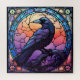 Décoré de vitraux, un corbeau déplaisant éffrayant tourne son regard vers le spectateur.