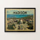 Le design de Madison Wisconsin dans le style Vintage voyage avec la ligne d'horizon de la ville de Madison, Wisconsin, capitole d'état avec vue sur le lac et ciel bleu.