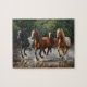 Capture the spirit of freedom with this dynamic and realistic painting of wild horses. This stunning scene depicts a group of varied equine breeds, including a black and white Pinto, powerfully galloping through shallow water, creating dramatic splashes. The rich forest backdrop and detailed water reflections make this a challenging and rewarding puzzle.