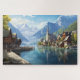 Puzzle with charming village lakeshore in Alps Mountains, fantasy illustration.
