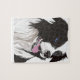 Ce puzzle inhabituel présente mon dessin d'un Collie noir et blanc aux yeux bleus. Le dessin est basé sur mon propre animal de compagnie Gypsy, qui a été un ami loyal pendant de nombreuses années. Elle avait les yeux marron, mais j'ai aussi vu des collies aux yeux bleus, et même un de chacun !