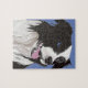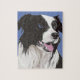 Ce puzzle inhabituel présente mon dessin d'un Collie noir et blanc aux yeux bleus. Le dessin est basé sur mon propre animal de compagnie Gypsy, qui a été un ami loyal pendant de nombreuses années. Elle avait les yeux marron, mais j'ai aussi vu des collies aux yeux bleus, et même un de chacun !