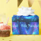 A pink and blue fractal interpretation of the Northern Lights and stars reflected on the surface of the sea. Text reading "Feliz Navidad" also appears in glowing blue and white. Qaanaaq is a settlement in northern Greenland.