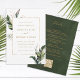 This all-in-one wedding invitation features watercolor green tropical foliage, palm tree leaf, banana leaf with faux gold leaves, and the details and a QR code website link on the back. It's perfect for a beach, summer, Hawaii or destination wedding.