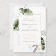 This all-in-one wedding invitation features watercolor green tropical foliage, monstera leaves, palm tree leaf, banana leaf with faux gold leaves, and the details and a QR code website link on the back. It's perfect for a beach, summer, Hawaii or destination wedding.