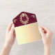 This baroque burgundy and gold all-in-one wedding invitation is the perfect mix of rich elegance and modern practicality. The luxurious deep red background with ornate golden monogram frame creates a royal and timeless look, while the foldable design doubles as its own envelope for easy mailing. Inside, the RSVP section features a scannable QR code that links directly to your wedding website for instant online responses. A sophisticated and convenient choice for couples hosting a formal, classic, or luxury wedding celebration.