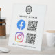A simple bold custom white business connect Us in Facebook & Instagram QR code pedestal sign in a modern minimalist style.