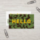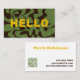 Hello in a bold font in gold yellow, on an asymmetric abstract design in brown and army green, this version has a qr code on the back.