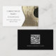 QR code Guitar music lessons business card, with an abstract guitar image with beige and brown shades on a white and black background. With black and white lettering, you can customize with your own information. The back is black and has a QR code that is scannable. Great for advertising and networking your musical business.