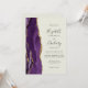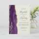 The left-hand edge features a purple watercolor agate border trimmed with gold faux glitter. The customizable text combines gold-coloured handwriting, copperplate and italic fonts on an ivory background. The reverse side provides space for wedding details on a solid ivory background, along with a QR code guests can scan to visit your website and RSVP, which saves the cost of printing and mailing separate RSVP cards.
