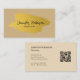 Modèle de design créatif et chic professionnel carte de visite : Un arrière - plan de couleur terreuse neutre (beige pastel) avec cadre en feuille d'or pour une touche de luxe. Au milieu, votre nom est écrit sur le script de calligraphie. Cette carte est scannable et intelligente grâce à son code QR. Le design est générique et féminin ; unique pour votre marque personnelle comme planificateur d'événements, concepteur d'intérieur, maquilleur, cosmétologiste, esthétique, soins esthétiques, propriétaire de salon de beauté, propriétaire de boutique, massothérapeute, esthéticienne, et plus encore.