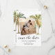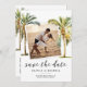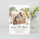 Summer destination save the date cards! Crafted with a simple white background, 2 photos of the bride/groom, tropical watercolor palm trees, a QR code (replace this with your own), and an easy to customize elegant template.