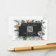 Wedding RSVP card with qr code on front and additional info on back. Front features tropical botanicals around dark grey rectangle shape.