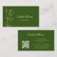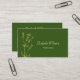 Professional business card featuring a gold line art hand drawn wildflower with texts in sans serif fonts on a green background. Modern minimalistic floral boho design with a template for your QR code on the back.