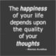 Quality Thoughts? Then a Happy Life… The actual quote from Roman Emperor and philosopher Marcus Aurelius is: "The happiness of your life depends upon the quality of your thoughts: therefore, guard accordingly, and take care that you entertain no notions unsuitable to virtue and reasonable nature." White text over black sticker.