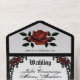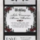 Elégant look de cadres de clôtures en fer et roses rouges foncé sur une invitation argentée avec script unique. Le retour RSVP a deux candélabres et livraison personnalisée au texte. Modifiez le texte pour ce dont vous avez besoin. Si vous avez besoin d'aide, envoyez-moi un message. Veuillez vérifier votre texte avant l'achat final