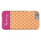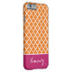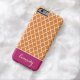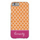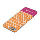 Simple, modern, elegant and trendy Quatrefoil, Lattice, Trellis or Moroccan pattern in Orange and White design with an accent stripe in Berry Pink colour and custom Monogram or Name in a preppy script font for Apple iPhone 6 cases and covers. Personalize your gift with your own name or initials. Choose your own font and colours to make it your own. This chic and stylish geometric pattern iPhone6 case will make a perfect gift or fashion accessory for Christmas, Birthday, College or School. Suitable for men, women, girls, boys, teenagers and kids. For more colours go to zazzle.com/d_zone_designs