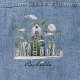 This classic jean jacket boasts an interesting design featuring watercolor illustration of a small pale lavender fairytale cottage, with wooden door and roof, sitting on a tall mound of moss green grass with a ladder. The design is embellished with various size glass jars holding tall green plants primarily Queen Anne's Lace flowers. Centred below is your name in black script typography. Easily change or remove the name using the Template provided. See "About This Product" at side for more information.