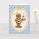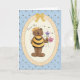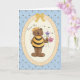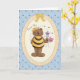 An adorable little teddy bear dressed up as a bumble bee with a crown and a bouquet of flowers.