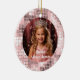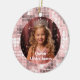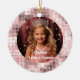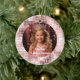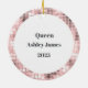 This ceramic Christmas ornament is shown with a holiday sample photo print and text: Queen, name and date.