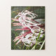 11” x 14” jigsaw puzzle with an image of a watercolor painting of burgundy and white Queen Emma lilies or Giant Spider Lilies (Botanical name: Crinum augustum).