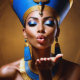 Reine Nefertiti (vers 1370 - vers 1330 avant JC). La reine Nefertiti, la grande épouse royale de Pharaon Akhenaten, est l'une des figures les plus célèbres de l'Égypte antique. Connue pour sa beauté et sa position puissante, elle a cogouverné pendant l'une des périodes les plus riches de l'histoire égyptienne et a joué un rôle dans la révolution religieuse du pays en promouvant le culte d'Aten, le disque solaire. Portrait stylisé imaginé de la reine Nefertiti avec un cou allongé et de hauts pommettes et des lèvres pleines, affichant une élégance et une beauté royale.