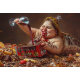 “Queen of Gluttonous Decay” Colourful Portrait. A darkly humourous and grotesque portrait symbolizing the consequences of unchecked indulgence. This surreal artwork depicts a woman grotesquely transformed into a witchetty grub amidst a mountain of sweets and wine, embodying the excesses of consumer culture and personal neglect.