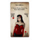 Pinup style queen of hearts design with grunge effects. Features an illustration of a beautiful young woman, with long black hair, wearing a red corset.