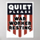 This vintage WW2 poster features a red, white, and blue shield. It reads, "Quiet Please, War Worker Resting". Celebrate WWII History and the Allied Effort with this digitally restored vintage propaganda poster from The War Is Hell Store.