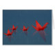 A family of red origami cranes floats across the still water of a pool while the raindrops splash around them.
