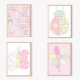 A combination of soft, quilt inspired designs, and a ladybug creates this cute, bedroom, wall decor art print. The background is pink, while the ladybug consists of white with light shades of green, yellow, and pink. This art print features a signature by me, the artist.