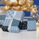 Quilt design. Seamless patchwork pattern from stitched squares with different geometric ornaments. Textile print in blue colours.
