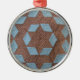 Quilt block in brown and blue "castle" pattern. The central "castle" is a brown star shape, surrounded by the "6 sided wall" with the "watch towers" extending out from the middle of the walls.