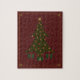 This elegant design features a quilted Christmas tree with jewel-toned ornaments adorning it and presents underneath, all surrounded by a delicate gold filigree border with jewels at the corners.