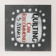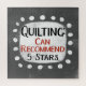 Un design typographique amusant qui dit "Quilting : Can Recommend, 5 Etoiles". C'est du texte en noir et rouge sur un rectangle blanc avec des points blancs amusants autour, le tout sur un arrière - plan gris.