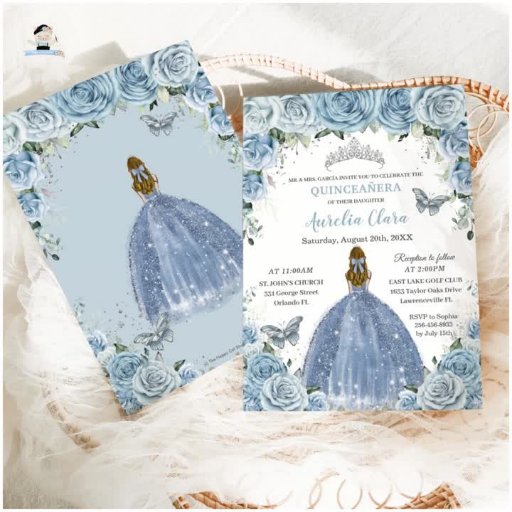 Soft Baby Blue Floral Silver Quinceanera Birthday Designed by The Happy Cat Studio