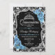 Features damask pattern, script font, aqua blue roses, tiara and confetti. Classy turquoise blue design with faux glitter silver. Perfect for an elegant glam celebration.