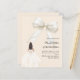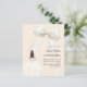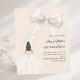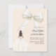 This sophisticated design features a large ivory bow adorned with delicate pearl details, paired with a graceful gown illustration. Champagne gold colored background.