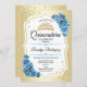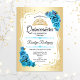 Features script font, aqua blue roses, tiara and confetti. Classy turquoise blue design with faux glitter gold. Perfect for an elegant glam celebration.