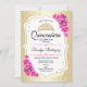 Features script font, pastel pink roses, tiara and confetti. Classy blush pink design with faux glitter gold. Perfect for an elegant glam celebration.