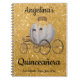 Quinceanera guest book with the fairy tale princess carriage design. The pretty gold background is a printed design that simulates gold glitter sparkle. The pages are white with black lines for guests to sign as they arrive for your daughter's special celebration.