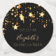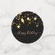Girly and feminine confetti for a Quinceañera, 15th birthday party table setting. A stylish black background decorated with dripping stars in faux gold. Templates for a date and name/age. Golden coloured letters. Some confetti chips with name and date, others with the text: Happy Birthday written with a trendy handlettered script with swashes.