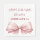 A white background color. Decorated with a large pink bow. Personalize and add the name and date. Text: Happy Birthday!