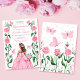 This elegant quinceanera invitation features a girl in a stunning princess dress with a large bow and tiara. There is a border of dusty pink roses and butterflies. The script font is elegant for a formal event. You can change all of the text to suit your event. The artwork is digitally drawn in Procreate in a digital watercolor style. See the whole matching collection.